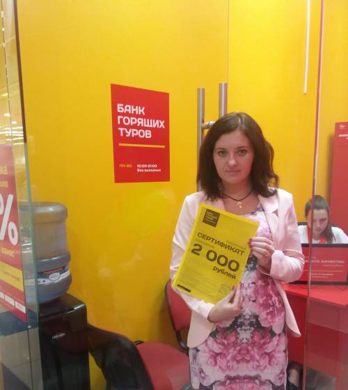 Знайшла компанію в Інтернеті, хороший сайт. Зверталась вперше, сподобалось обслуговування в офісі. У майбутнньому очікую подальшого співробітництва з Банком гарячих турів....