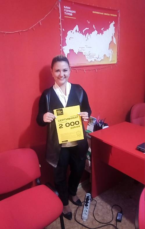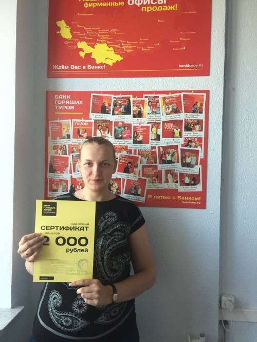 Первый раз приобрела тур в Банке горящих туров, узнала о компании через интернет. Понравился сервис в фирменном офисе продаж в Ангарске, удобный сайт. В будщем от компании ожидаю х...